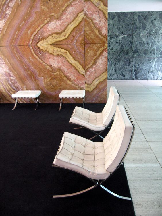 독일관 당시 스페인 국왕의 접견이 이루어지는 장소였기 때문에 미스 반 데어 로에는 권위와 전통이 있는 역사적 가구에서 모티프를 따고자 했다.